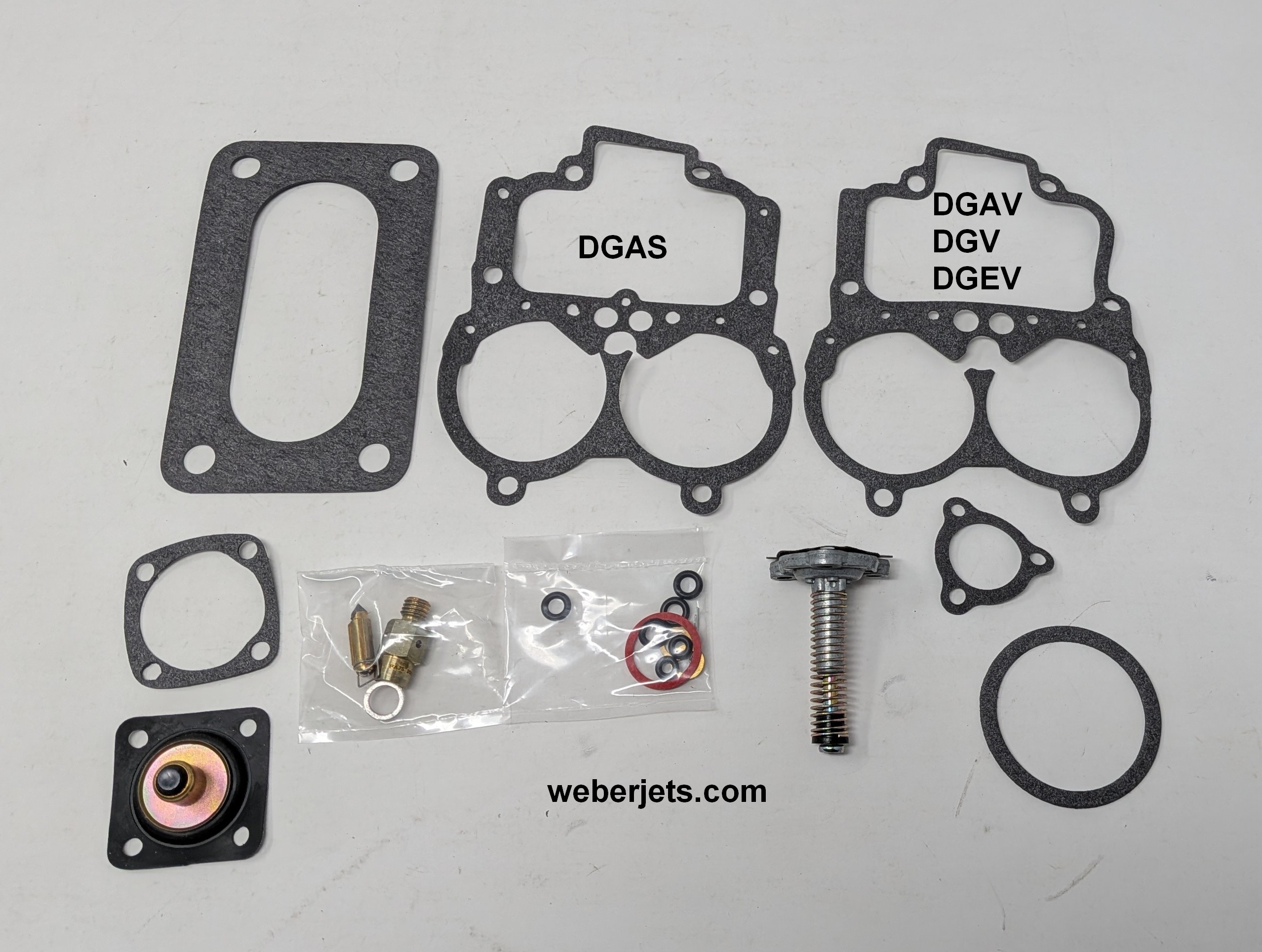 DGV DGEV DGAV DGAS all gaskets and o rings included in this repair kit. Comes with power valve diaphragm and 200 needle valve, pump diaphragm, top cover gasket for DGV/DGAV/DGEV and 38 DGAS